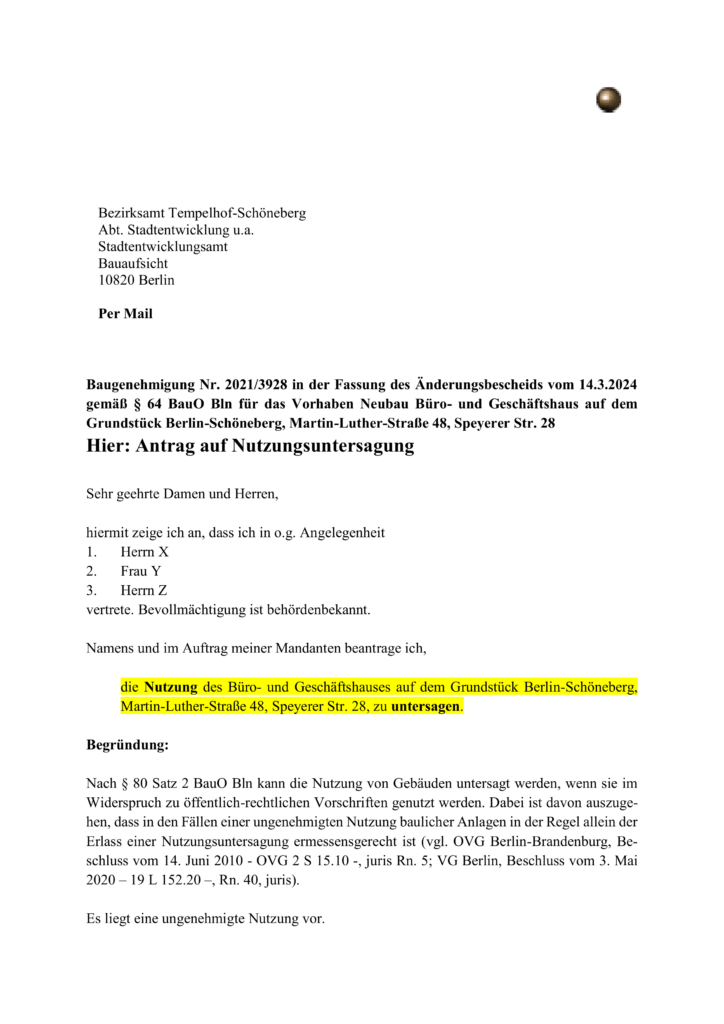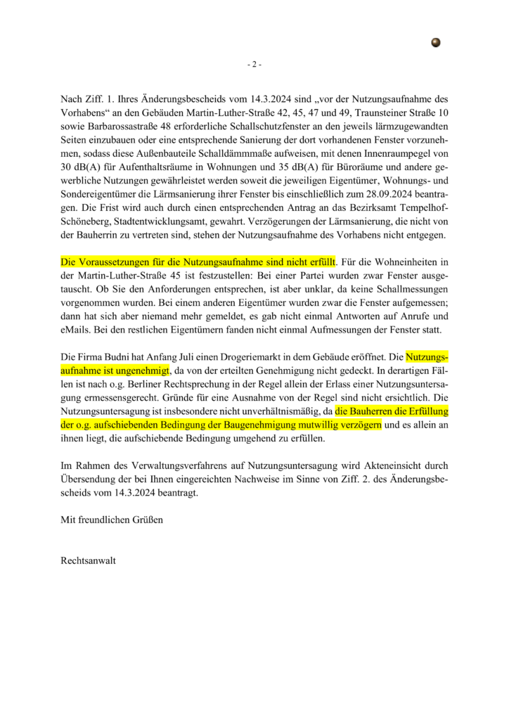 unsere nachbarschaftliche, gesetzeskonforme Gegenwehr gegen den willkürlichen Bau-Unsinn in Schöneberg ist konkret auf dem Weg. Zum juristisch gegebenen Zeitpunkt!